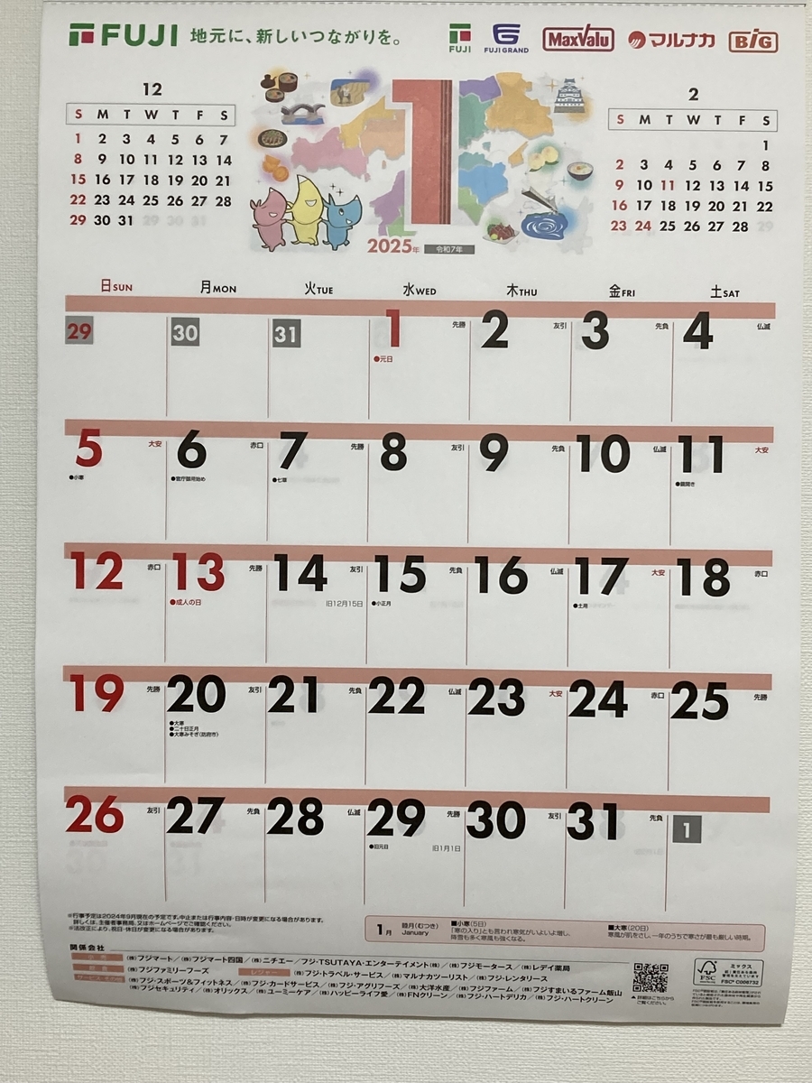 12月5日、フジ(8278)から、2024年8月末の隠れ優待であるオリジナルカレンダーが届いたのである。隠れ優待ということで、配賦基準は明示されていないが、100株以上の株主が、申し込みをすればもらえるようなのである。写真のとおり、オリジナルカレンダーは54㎝×38㎝とまずますの大きさで、月ごとに1枚、各日余白があり予定を書き込むのに便利なのである。